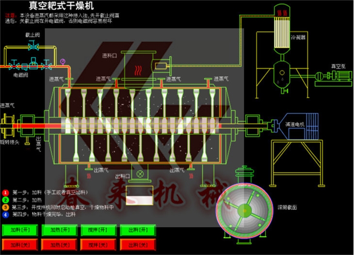 1. 本干燥設備是在引進吸收國內(nèi)耙式干燥技術(shù)的基礎上改進的一種新穎臥式間歇式真空干燥設備,濕物料經(jīng)傳導蒸發(fā),帶有刮板攪拌器不斷清除熱面上的物料,并在容器內(nèi)推移形成循環(huán)流,水分蒸發(fā)后由真空泵抽出。
