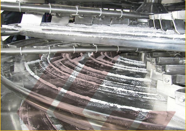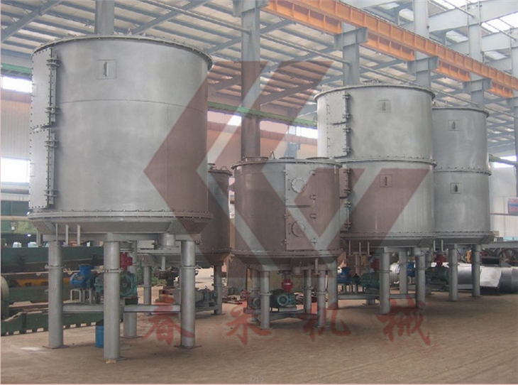 濕物料加料器連續(xù)地加到干燥器上部第一層干燥盤上,帶有耙葉的耙臂作回轉(zhuǎn)運(yùn)動(dòng),使耙臂連續(xù)地翻炒物料。物料沿指數(shù)螺旋線流過干燥盤表面,在小干燥盤上的物料被送到外緣,在大干盤上的物料向里移動(dòng)并從中間落料口落入下一層小干燥盤中。大小干燥盤上下交替排列,物料得以連續(xù)地流過整個(gè)干燥器。中空的干燥盤內(nèi)通入加熱介質(zhì),加熱介質(zhì)形成有飽和蒸汽、熱水和導(dǎo)熱油,加熱介質(zhì)由干燥盤的一端進(jìn)入,從另一端導(dǎo)出。已干物料從^后一層干燥盤落到殼體的底層,^后被耙葉送到出料口排出。濕氣從物料逸出,由設(shè)在頂蓋上的排濕口排出,真空型盤式干燥機(jī)的濕氣由設(shè)在頂蓋上的真空泵口抽出。從底層排出的干燥物料可直接包裝。通過配加翅片加熱器、溶劑回收冷凝器、布袋除塵器、干料返混機(jī)構(gòu)、引風(fēng)機(jī)等輔機(jī),可提高其干燥的生產(chǎn)能力,干燥膏糊狀和熱敏性物料,可方便地回收溶劑,并能進(jìn)行熱解和反應(yīng)操作。