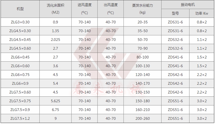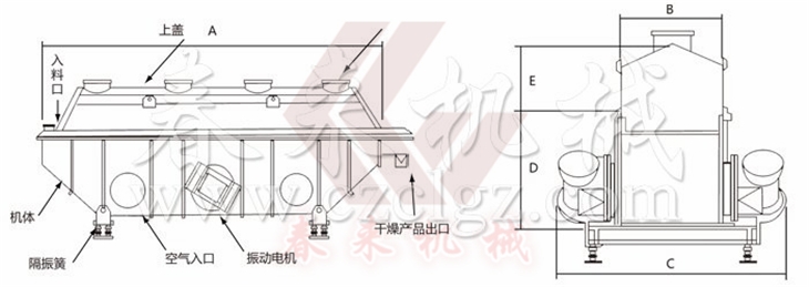 ZLG振動流化床干燥機(jī)廣泛使用于化工、輕工、醫(yī)藥、食品、塑料、糧油、礦渣、制鹽、糖等行業(yè)的粉料的干燥、泠卻、增濕等作業(yè)。物料自進(jìn)料進(jìn)口進(jìn)入機(jī)內(nèi),在振動力作用下,物料沿水平面流化床拋擲,向前連續(xù)運(yùn)動,熱風(fēng)向上穿過流化床同濕物料換熱后,濕空氣經(jīng)旋風(fēng)分離器除塵后由排風(fēng)1:3排出,干燥物料由排料進(jìn)口排出。