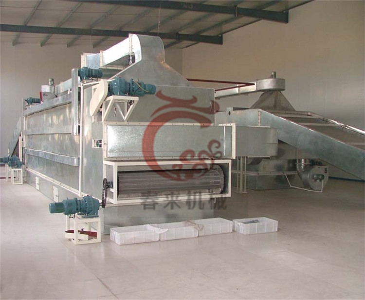 物料由加料器均勻地鋪在網(wǎng)帶上,網(wǎng)帶一般采用12-60目不銹鋼絲網(wǎng),由傳動裝置拖動在干燥機內(nèi)移動。干燥機由若干單位組成,每一單元熱風獨立循環(huán),部分尾氣由專門排濕風機排出,廢氣由調節(jié)閥控制,熱氣由下往上或由上往下穿過鋪滿物料的網(wǎng)帶完成熱量與質量傳遞的進程,帶走物料水份。網(wǎng)帶緩慢移動,運行速度可根據(jù)物料溫度自由調節(jié),干燥后的成品連續(xù)落入收料器中。上下循環(huán)單元根據(jù)用戶需要可靈活配備,單元數(shù)量可根據(jù)需要選取。