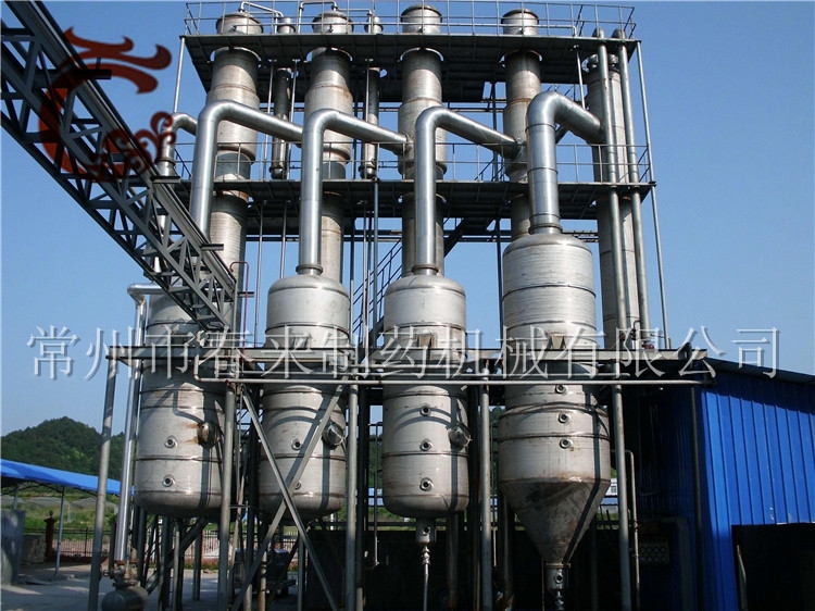 各效加熱器、各效分離器、冷凝器、各效料液泵組、保溫管、真空及排水系統(tǒng)、分氣缸、操作平臺(tái)、電器儀表控制柜及閥門、管路等組成。