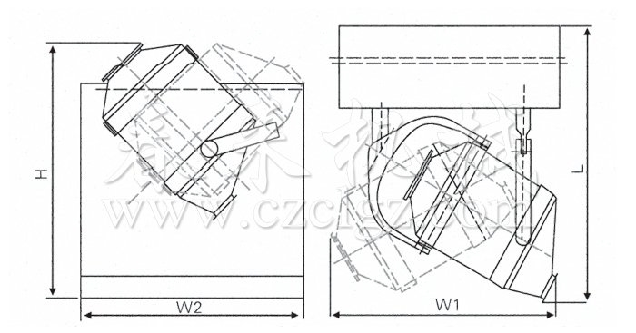 裝料的筒體在主動(dòng)軸的帶動(dòng)下,作周而復(fù)始的平移、轉(zhuǎn)動(dòng)和翻滾等復(fù)合運(yùn)動(dòng),促使物料沿著筒體作三向復(fù)臺(tái)運(yùn)動(dòng),從而實(shí)現(xiàn)多種物料的互相流動(dòng)、擴(kuò)散、積聚、摻雜.以達(dá)到均勻混合的目的。