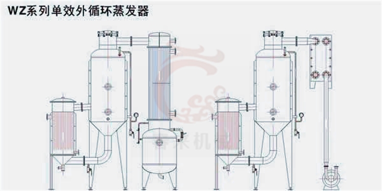 WZ型外循環(huán)式真空蒸發(fā)裝置主要由列管式加熱器,蒸發(fā)罐,循環(huán)管及其他附屬設(shè)備所組成。