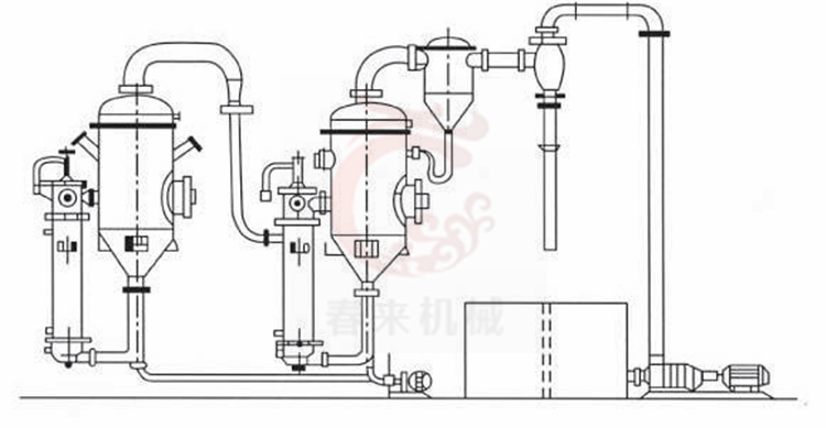 料液在加熱器的管內(nèi)被加熱至沸點后,部分水汽化,使熱能轉(zhuǎn)換為向上運(yùn)動的動能;同時由于加熱管內(nèi)汽液混合物和循環(huán)管中未沸騰的料液之間產(chǎn)生了重度差,在膨脹動能和重度差的誘導(dǎo)下,產(chǎn)生了料液的自然循環(huán)(料液在加熱管內(nèi)的循環(huán)速度小于1m/s),料液受熱量愈多,沸騰愈好,其循環(huán)速度也就愈大。由于是在真空作用下蒸發(fā),其料液的蒸發(fā)溫度可以控制在50℃以下。蒸發(fā)出的二次蒸汽經(jīng)離絲網(wǎng)除沫和捕液器捕集后,被水力噴射泵的噴水冷凝后帶走。蒸發(fā)罐內(nèi)的料液經(jīng)離心旋轉(zhuǎn)后,沿外循環(huán)管回到加熱器的下部,進(jìn)行再循環(huán)加熱蒸發(fā),如此循環(huán)加熱蒸發(fā)(15~20分釧),當(dāng)達(dá)到要求的濃度時,開始出料。